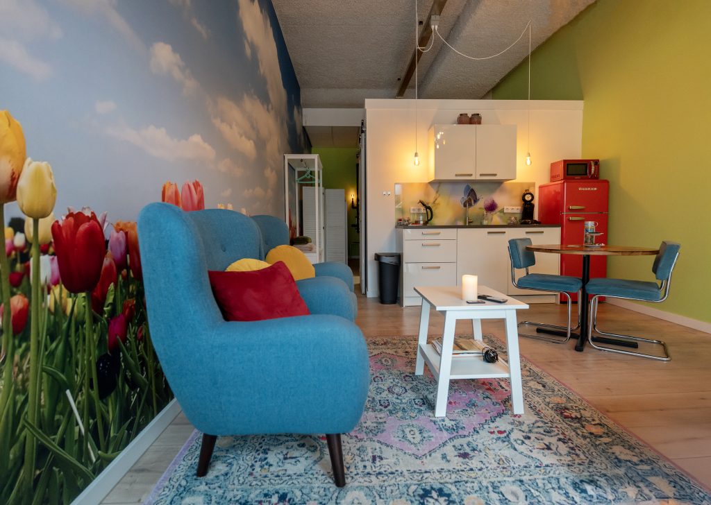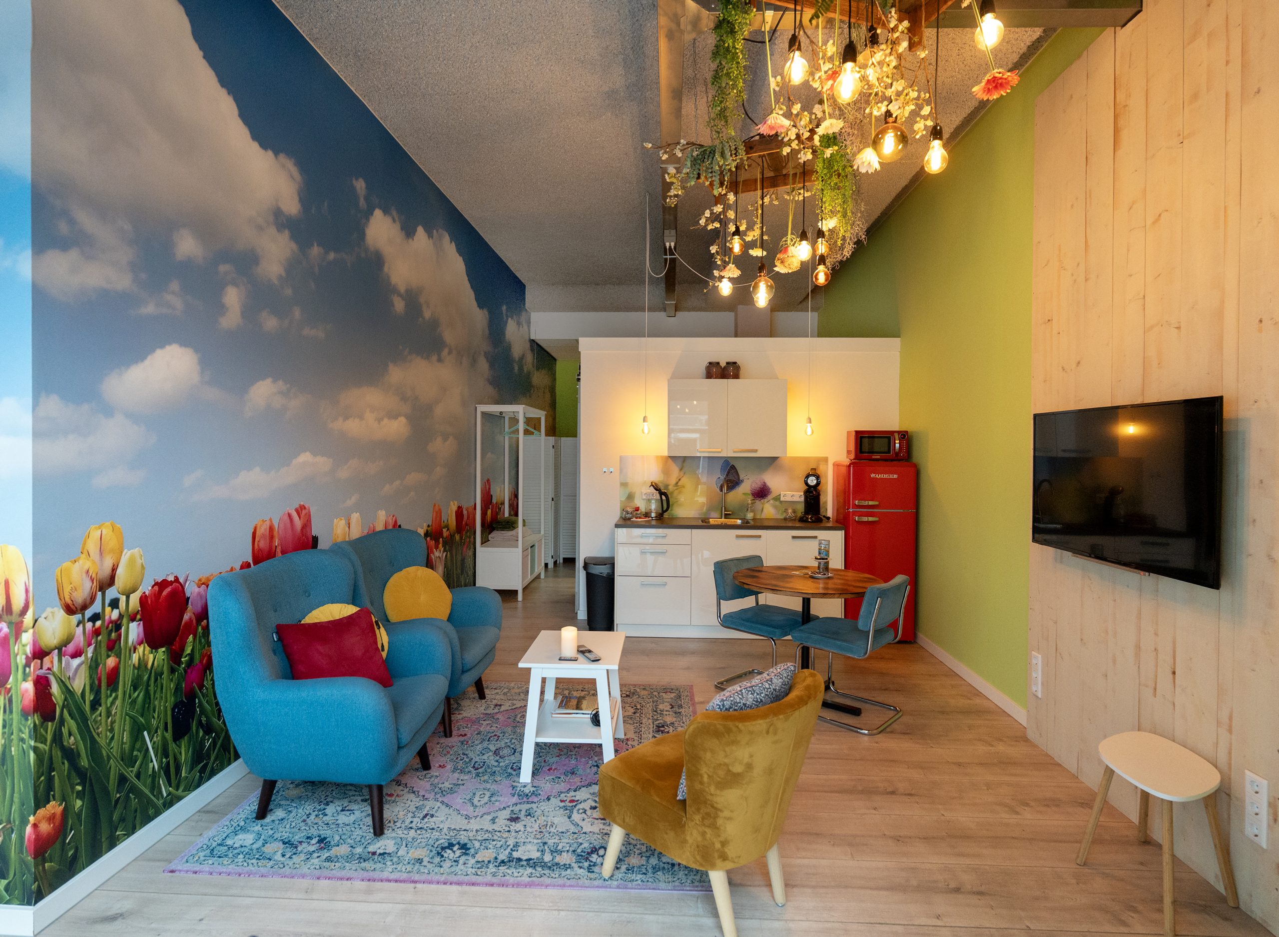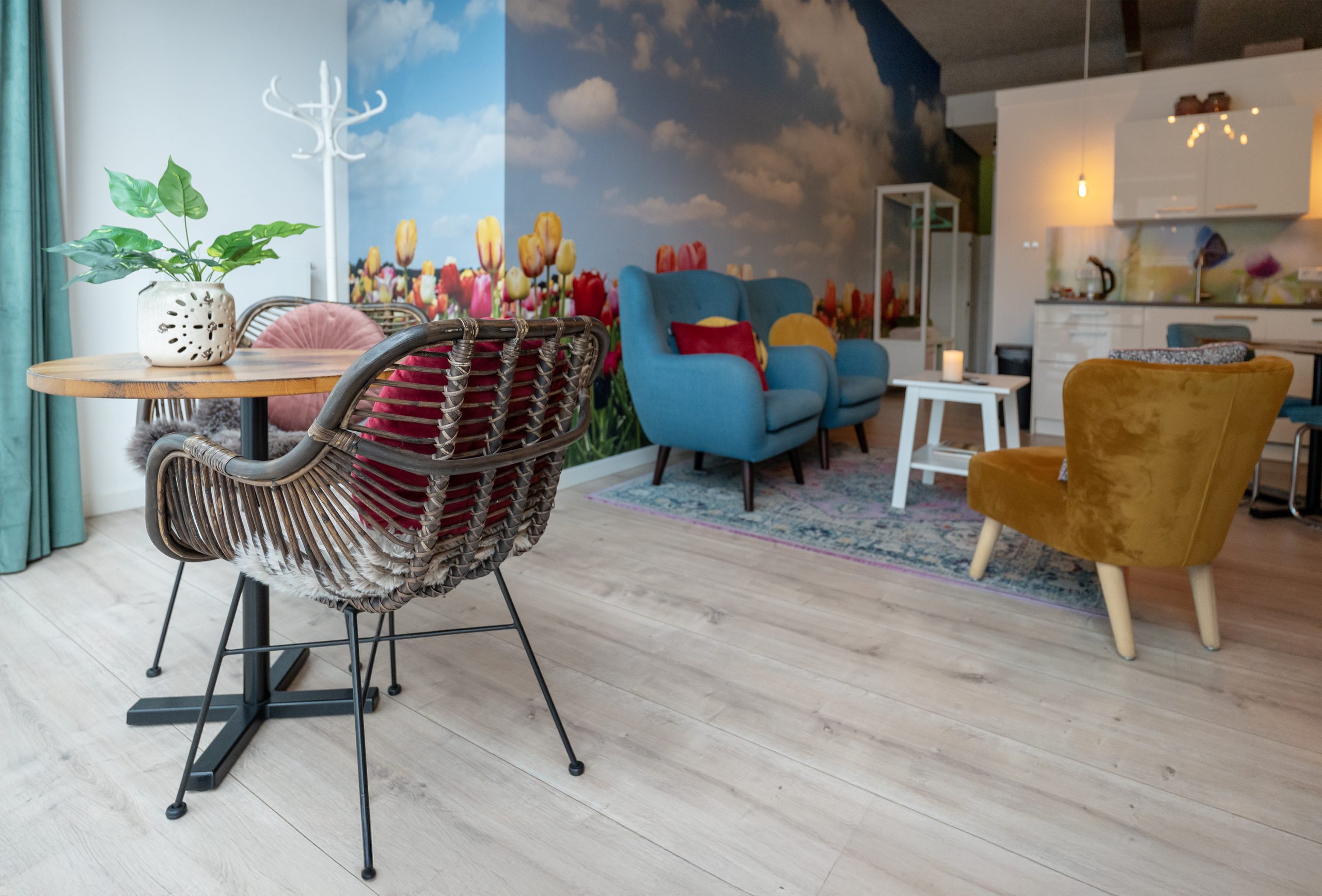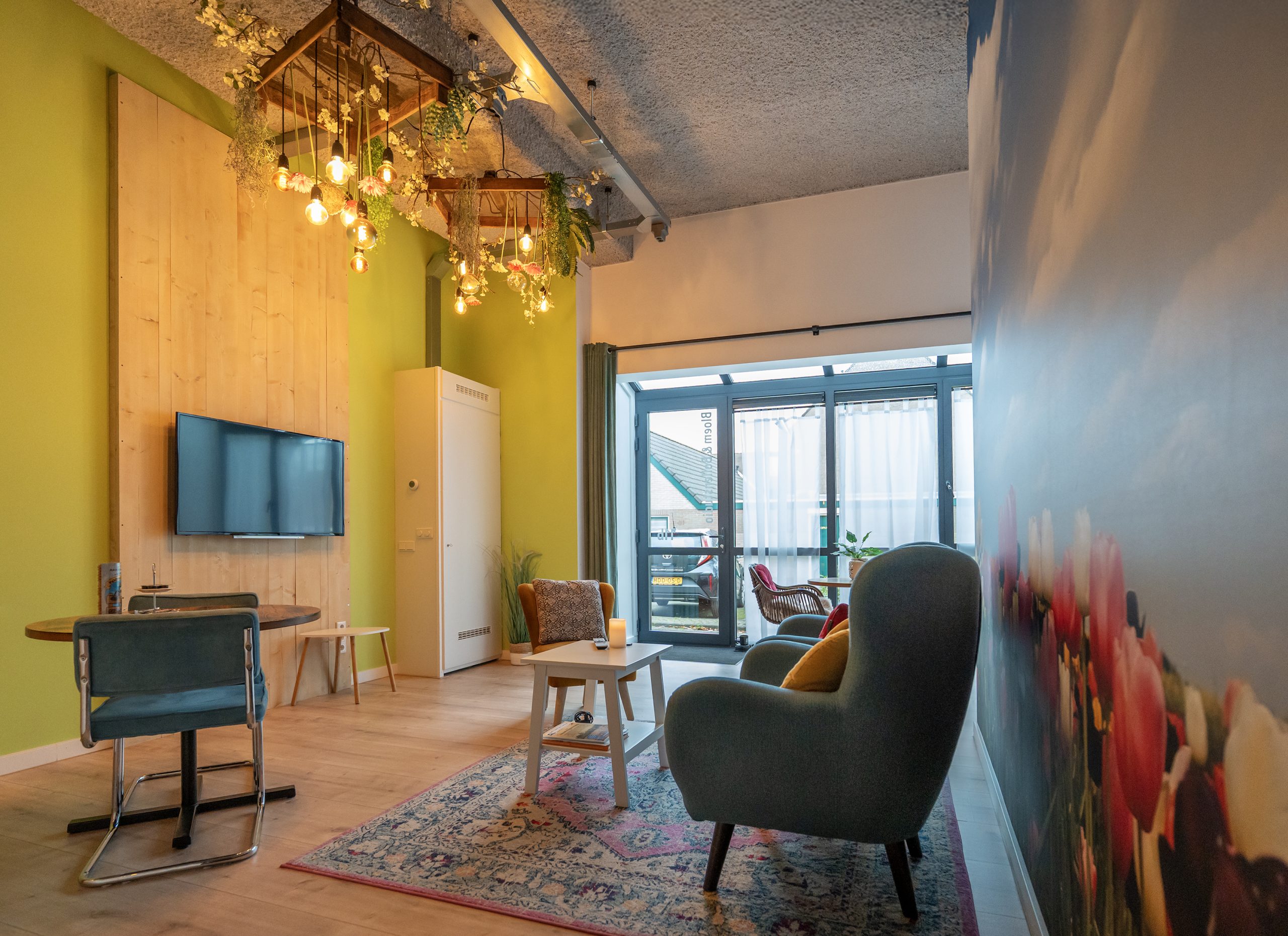 De Bloem & Bloembollen Studio is een van onze 2 familie kamers. Deze ruime en luxe studio heeft een eigen (privé) ingang. De Studio is gelegen aan de zijde en heeft een grote raampartij waardoor het appartement fris en licht oogt.
