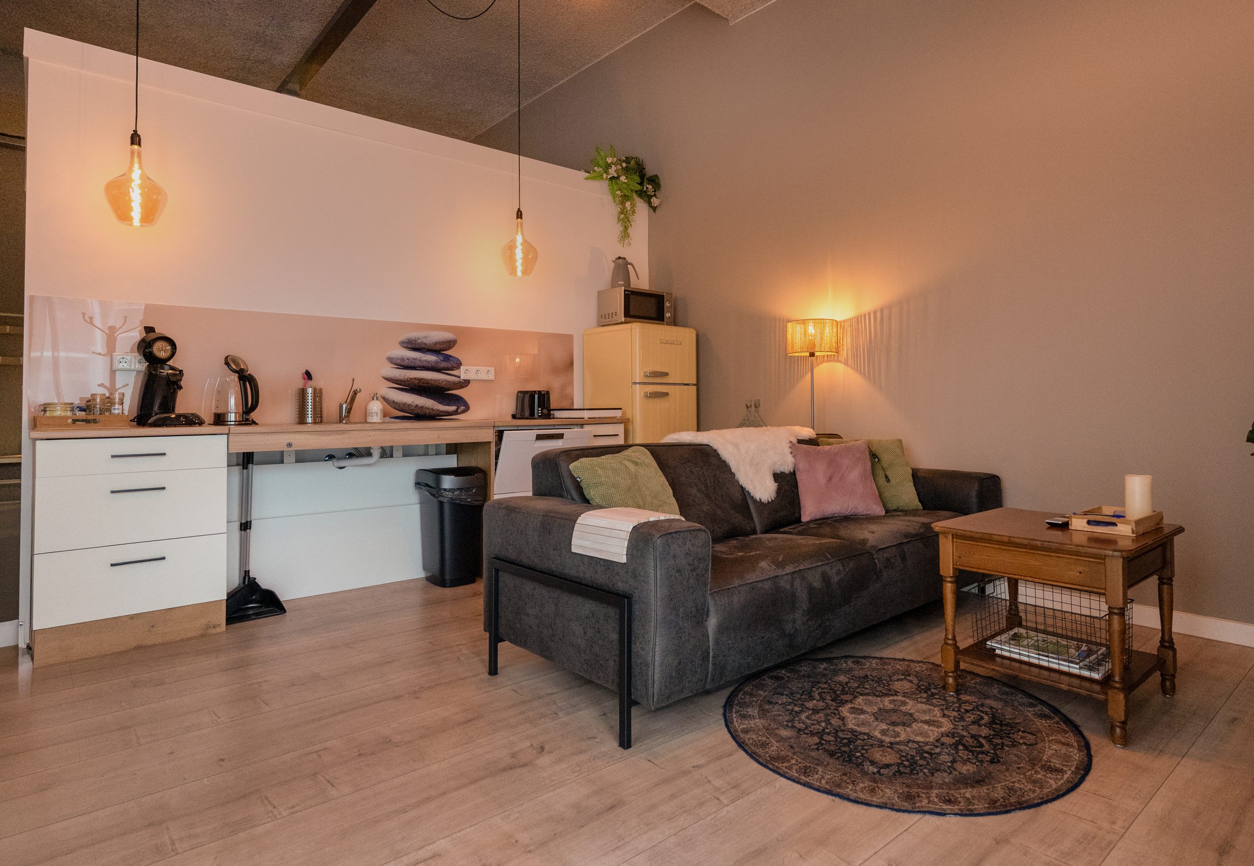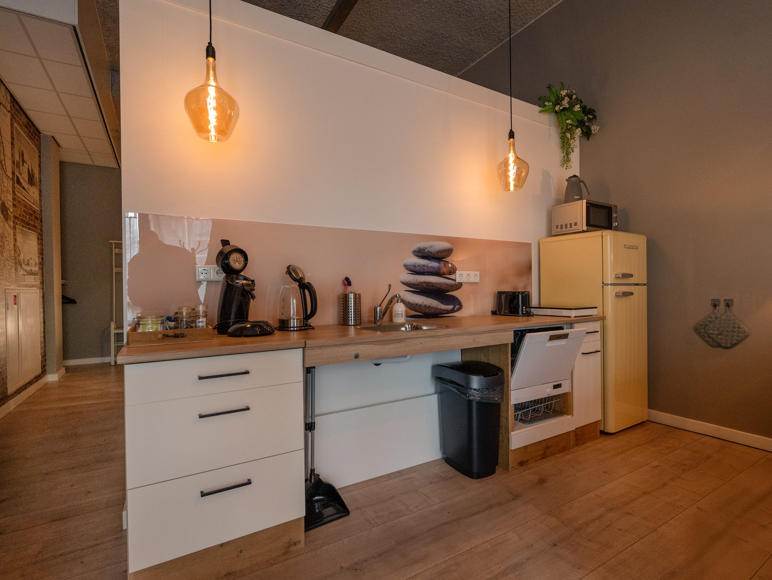 De ruimte heeft een schitterende eigen keuken die uitgerust is met alle apparatuur zoals een inductie kookplaat, een magnetron, een waterkoker, Senseo koffieapparaat, keukengerei, afwasmachine en een grote koel-vrieskast. Koffiepads, diverse theesoorten, koffiemelk en suiker zijn in de kamer aanwezig, net als afwasmiddel en vaatwas tabletjes. U kunt heerlijk genieten van uw maaltijd aan een eettafeltje met twee stoelen. Of u kunt even tot rust komen in de zithoek met een bank (of comfortabele stoelen) en smart-tv (60inch).