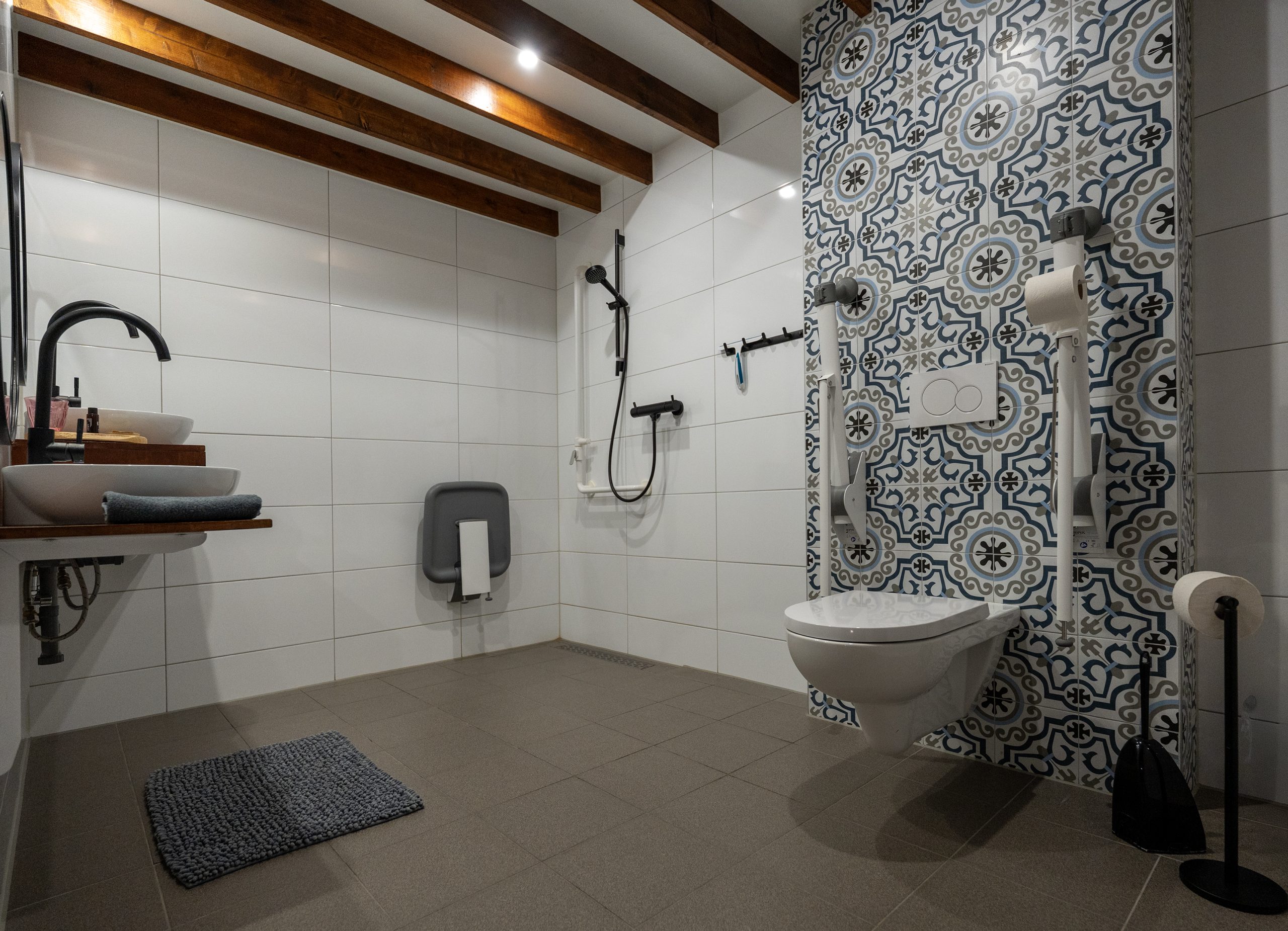 De luxe privé badkamer is uitgerust met een ruime rolstoeltoegankelijke douche met zitje en beugel, twee wastafels welke verschillen in hoogtes, en toilet met stevige beugels. Handdoeken en een haardrogerzijn tot uw beschikking.